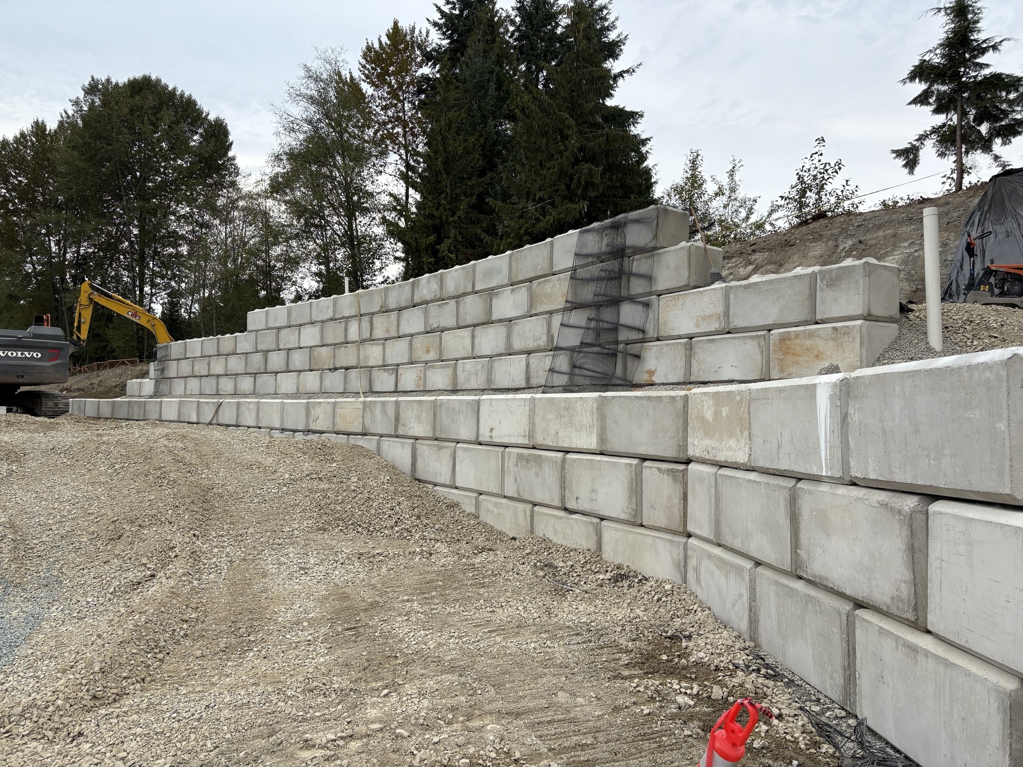 - Subgrade and backfill verification: We reviewed wall subgrades, monitored geogrid placement for length and flatness, and completed in-place density testing on structural backfill, achieving at least 95% of MPMDD before authorizing subsequent lifts and geogrid layers.